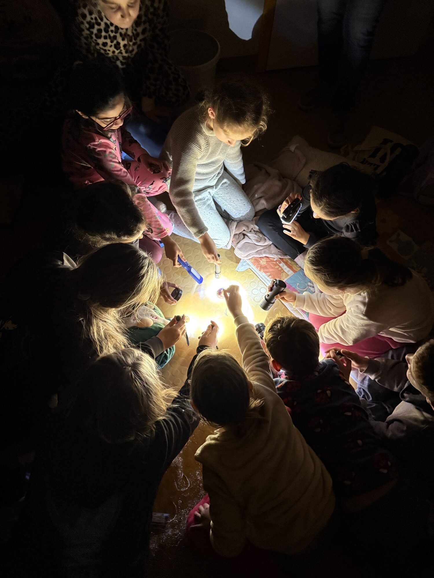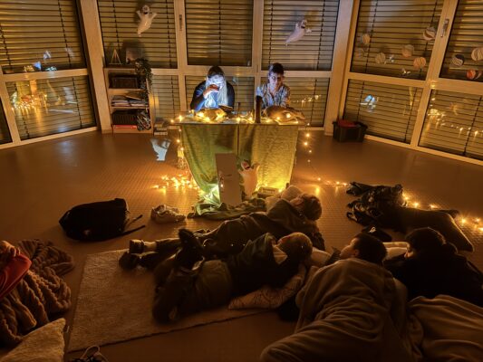 Zum Abschluss gab es ein kleines Highlight: Ein interaktives Spiel im Dunkeln. Ausgestattet mit Taschenlampen mussten die Kinder ein Rätsel lösen. Nachdem sie alle gestellten Aufgaben des “Schattenvolks” gemeistert hatten, machten sie sich im gesamten Schulhaus auf die Suche nach einem geheimnisvollen magischen Nachtlicht. Als dieses schließlich gefunden wurde, versammelten sich alle Kinder im Kreis und tanzten und sangen gemeinsam das Lied „Lichterkinder“.